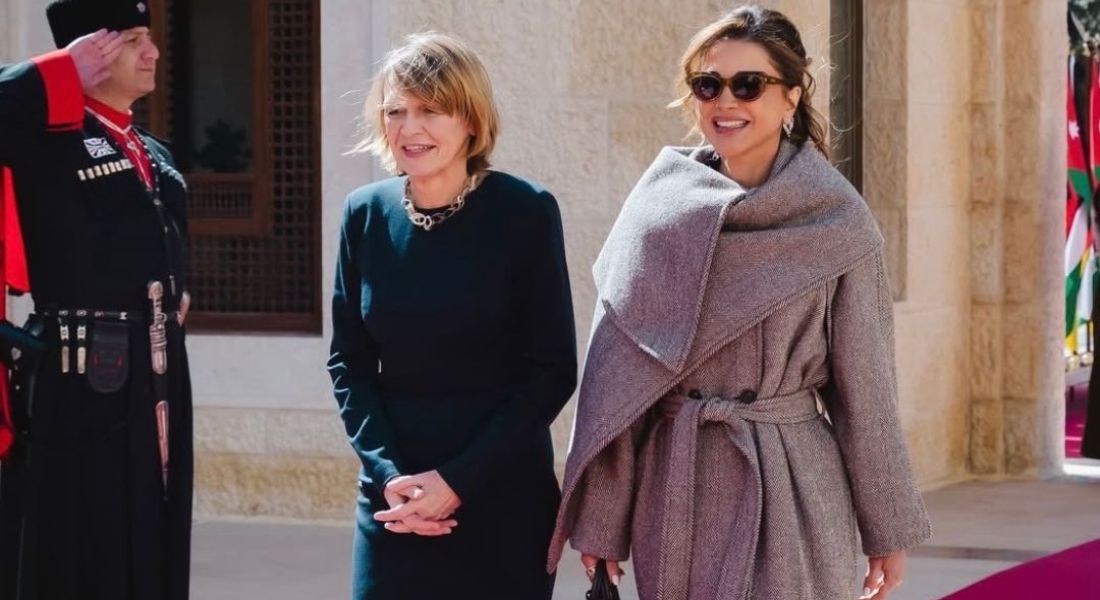 Queen Rania of Jordan Embraces Monochrome Dressing for Diplomatic Welcome