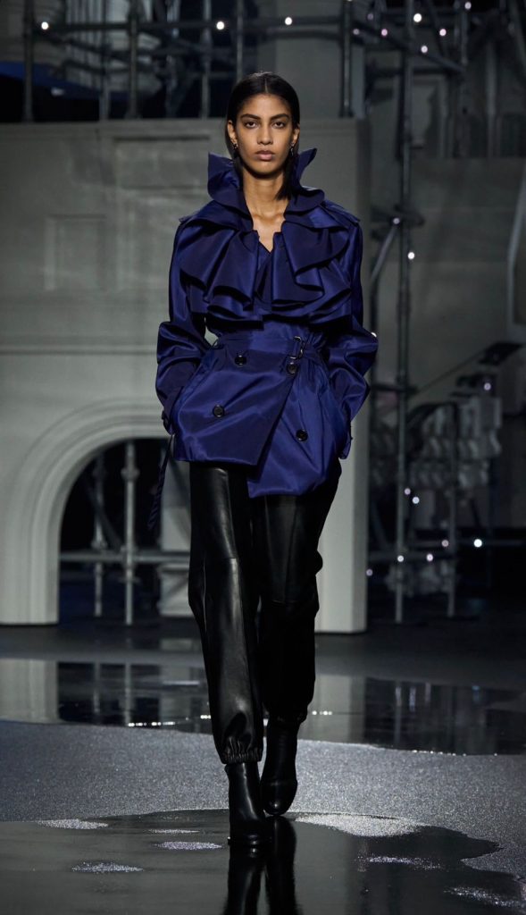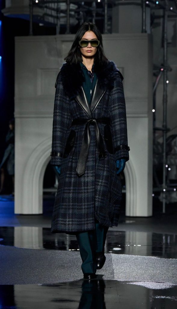 At the heart of the show was Burberry’s signature trench coat. Lee reworked it in multiple forms, from softened versions with ruffled collars to technical taffeta styles and bold plaid designs. Some swept the floor, while outerwear also included a check shearling jacket and a deep plum overcoat with oversized fur lapels.
