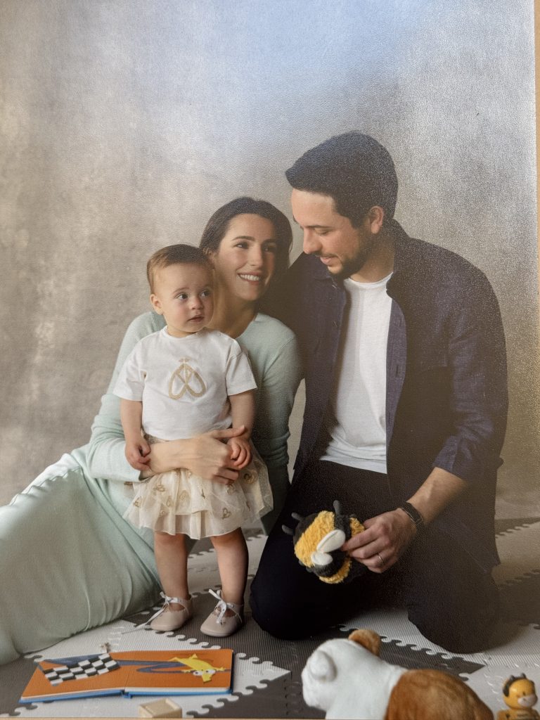 The New Year card of Crown Prince Al Hussein and Princess Rajwa has been circulating on social media for the past week. Since their marriage, the royal couple has begun the tradition of sending their own greetings. The photo shows the couple with their adorable daughter, sitting cosily at home, with Prince Al Hussein holding his daughter’s favourite toy, while Princess Rajwa looks stunning in a light blue knitted midi dress.