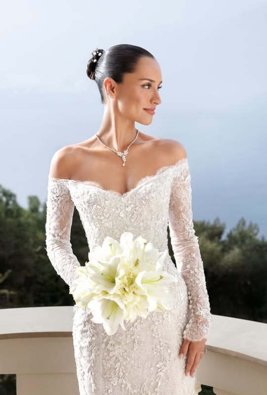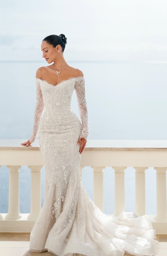 For her wedding, Alexandra chose custom couture by Paolo Sebastian, commissioning a gown that balanced heritage craftsmanship with modern refinement. Crafted from French Chantilly lace, the design featured a sculpted fishtail silhouette that traced the body before gently flaring at the hem. The off-the-shoulder neckline was finished with soft scalloped edges, lending a romantic frame to the décolletage, while sheer lace sleeves added structure and delicacy in equal measure.