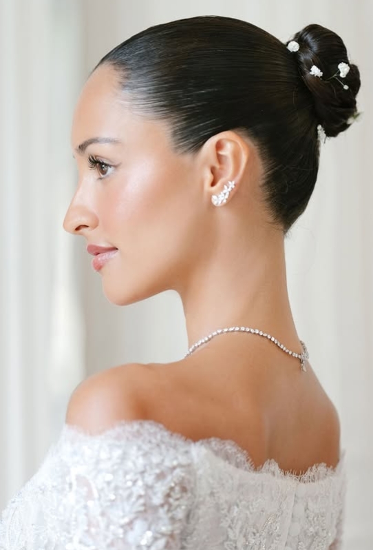 What elevated the gown were its intricate details: subtle 3D floral appliqués and bespoke embroidery incorporating the couple’s initials and wedding date, a quiet nod to permanence stitched directly into couture. The result was timeless rather than trend-driven, refined rather than ornate. Her beauty look followed the same philosophy.