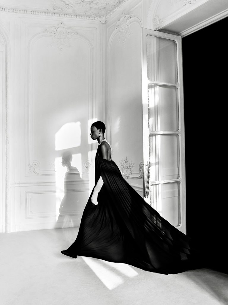 This is high-fashion thinking applied to everyday scenarios. A cashmere cape might be thrown over TechWear leggings after a morning workout. A sharply cut car-coat in neo-gazar feels as appropriate for a coffee meeting as it does for an art opening. Opera gloves appear alongside relaxed tailoring, as if elegance has slipped into daily routine. Even the techno ballgown feels less like a spectacle and more like an exploration of how eveningwear might exist in a world shaped by performance fabrics and athletic codes. The Balenciaga woman remains bold and uncompromising, her strength expressed through heightened silhouettes, cowled hats, and delicate heels that recalibrate our understanding of grace in modern dressing.