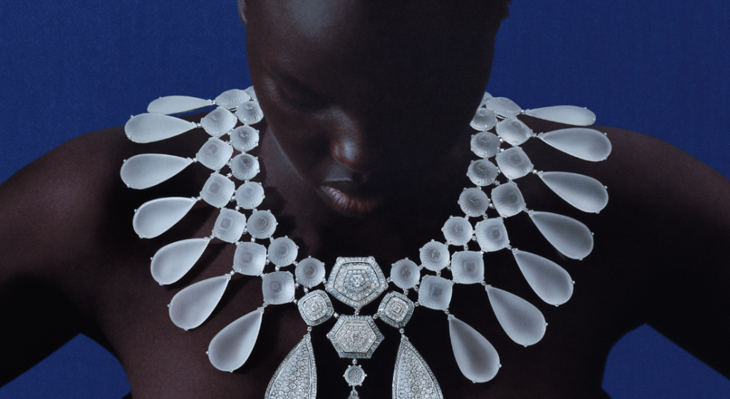 Nature's artistry takes centre stage in "Ciel de Glace." Here, rock crystal, carved with the undulating textures of Iceland's ice caves, is paired with a gradient of blue sapphires, creating an icy masterpiece. This piece exemplifies Boucheron's ability to translate the raw beauty of nature into a luxurious jewel.