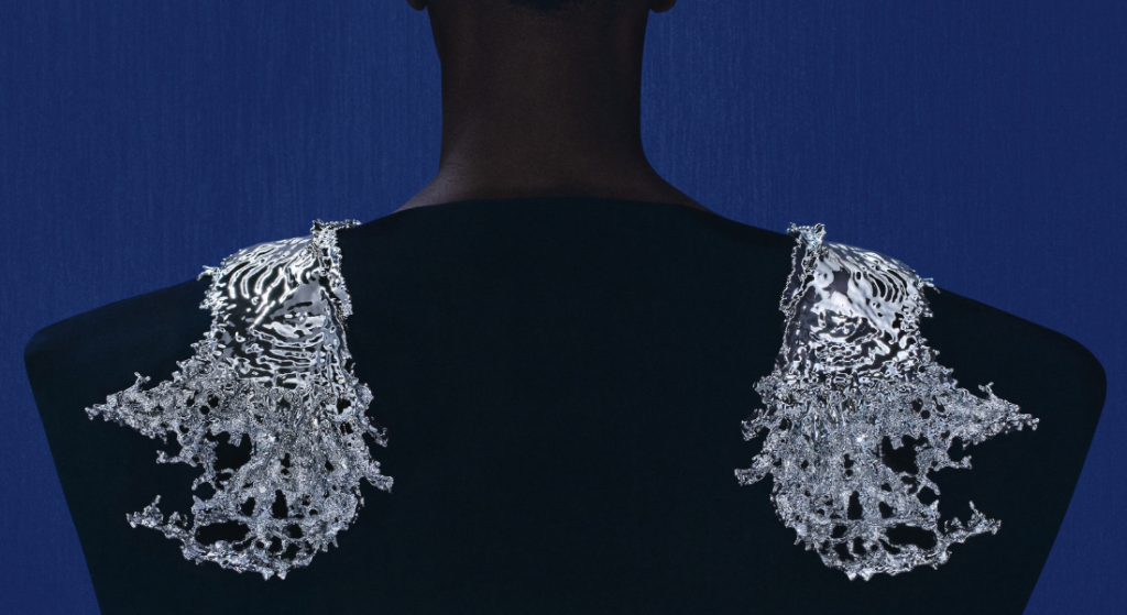 Innovation meets functionality in "Eau Vive" shoulder brooches. Crafted from lightweight aluminium and dipped in palladium for added shine, these statement pieces showcase the Maison's willingness to experiment with new materials while prioritising comfort.