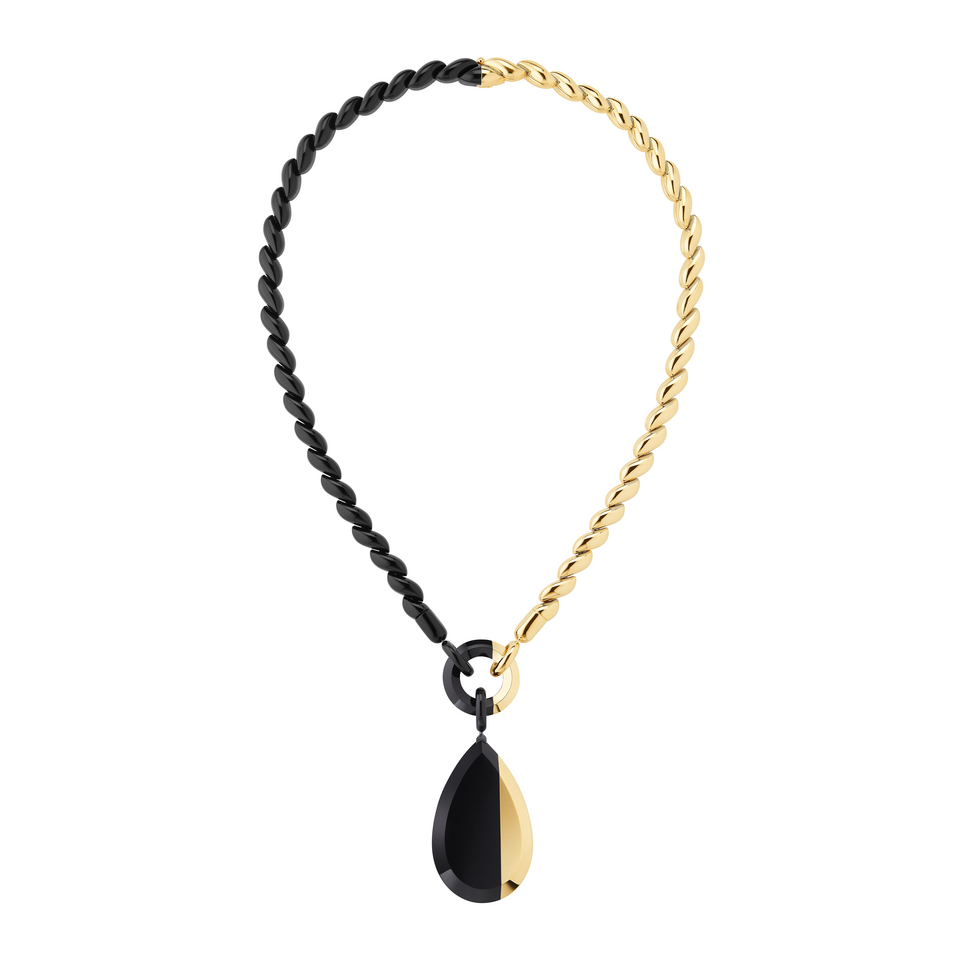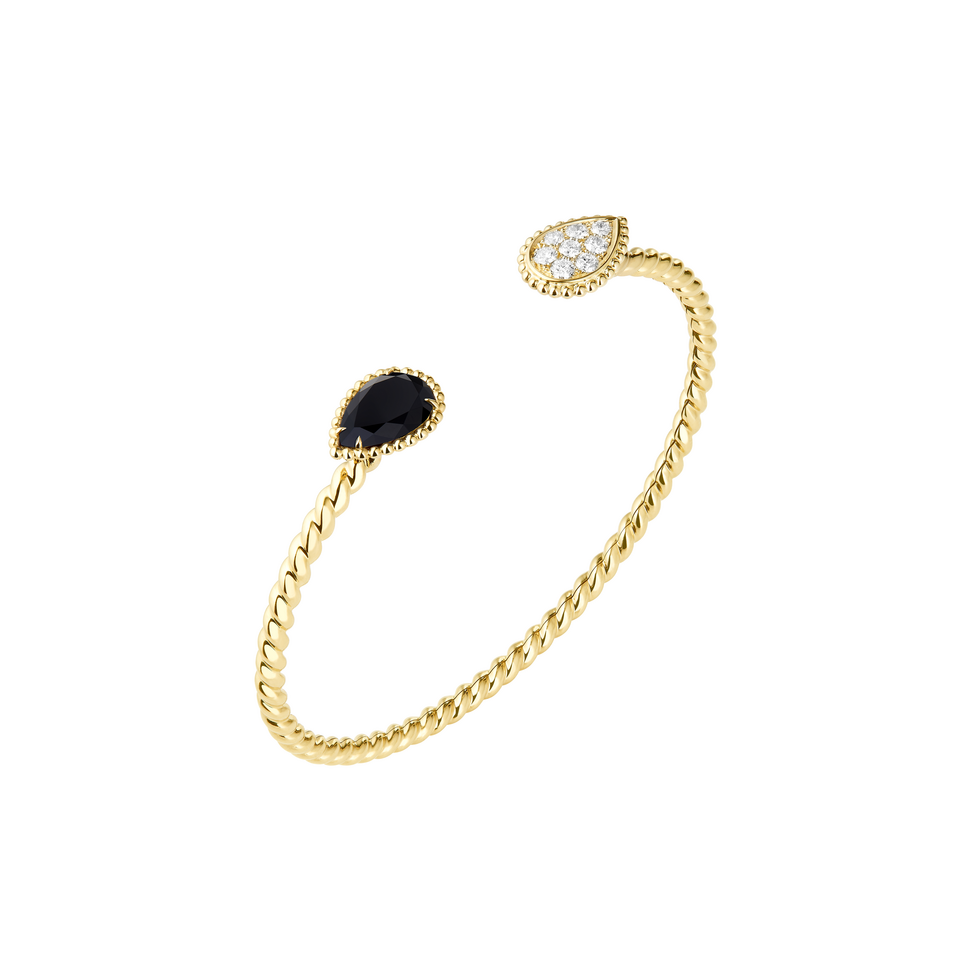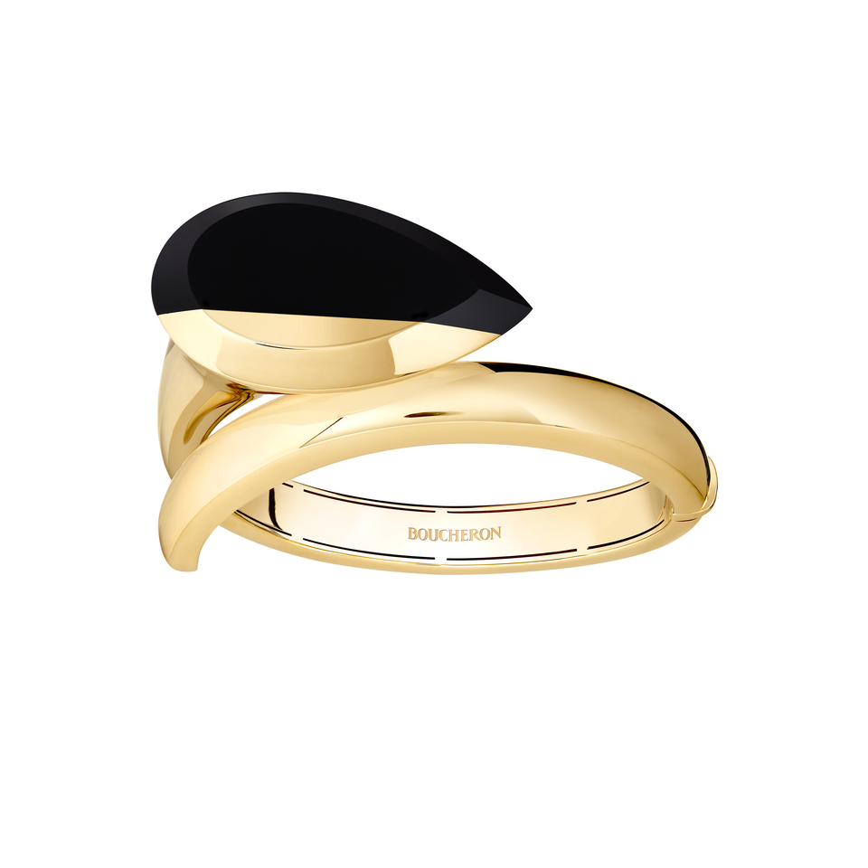 Balancing this intensity are three ultra-luminous designs in which polished yellow gold replaces the stone at the heart of the motif. A pendant, earrings, and ring capture warmth and clarity, allowing form and surface to take precedence. Completing the chapter are four statement pieces imagined by Creative Director Claire Choisne, where onyx and polished gold coexist. An XXL bracelet and ring, alongside a pendant and brooch, explore scale, reflection, and contrast, offering flexibility in how they are worn—alone or layered.