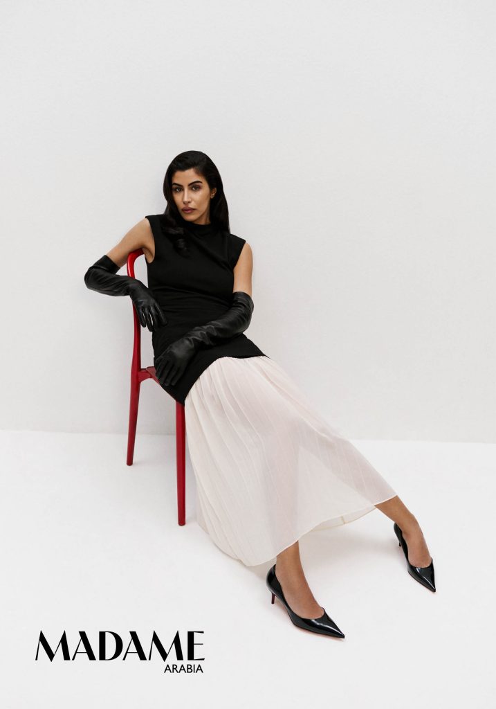 She means business: A serial fashion entrepreneur, Ezzat has made a name for herself in the Middle East and beyond. Left: Shoes: Christian Louboutin Miss Z 60 Patent Lining /Black Outfit: French Connection