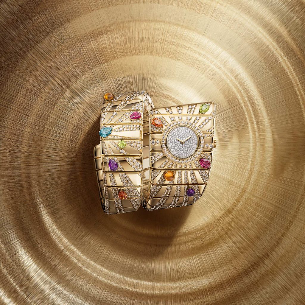 Tubogas Manchette: Bvlgari reimagines one of its most iconic signatures with the Tubogas Manchette, a radiant expression of jewellery-led watchmaking. Inspired by an archival 1974 design, the timepiece pairs a bold square dial with a wide single-coil Tubogas bracelet that wraps the wrist with sculptural elegance. Crafted in gold and illuminated by nearly 12 carats of diamonds, the Manchette is brought to life with a vivid palette of citrines, rubellites, peridots, amethysts, topazes and spessartites. A new modular construction technique enhances its fluidity, preserving Tubogas’ signature suppleness while infusing the design with contemporary brilliance and colour.