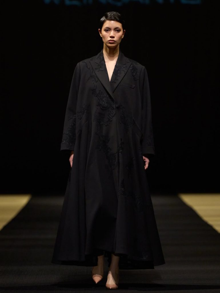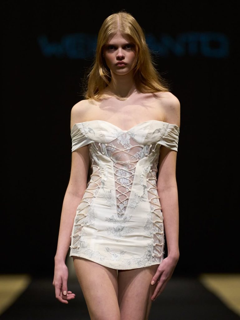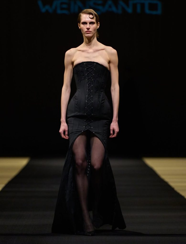 Victor Weinsanto brought his signature Parisian theatrics to the Dubai Fashion Week AW26 runway, reaffirming his reputation for “club-kid couture.” The collection fused high-fashion craftsmanship with a playful irreverence, spotlighting his trademark exaggerated corsetry and sculptural draping. His iconic “Vase Dress” — a full-body corset concept — returned in heavier, winter-ready fabrics, while bold, structured textiles evoked architectural forms throughout the show. Movement-driven fringes introduced a sense of dynamism, paired with edgy styling that gave the runway a couture-meets-punk aesthetic. Staying true to his ethical stance, Weinsanto also incorporated upcycled and surplus materials, reinforcing that fashion can still be responsible.
