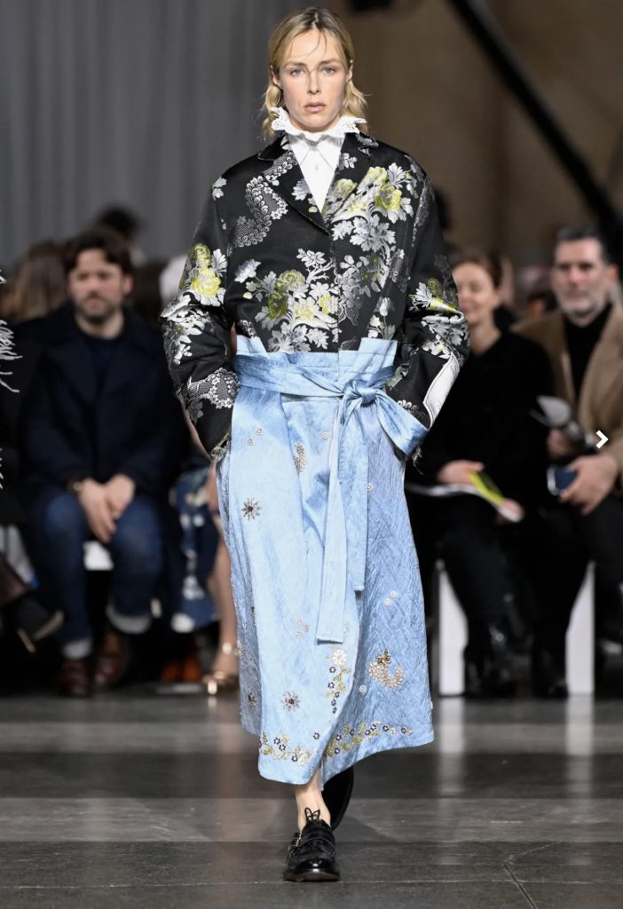 There were echoes of earlier Erdem silhouettes throughout, though they were reworked with fresh ideas. Embroidered canvas bodices introduced a subtle edge, while crystal-embellished opera coats emerged from a collaboration with Barbour, complete with the heritage brand’s logo stitched onto the sleeves.