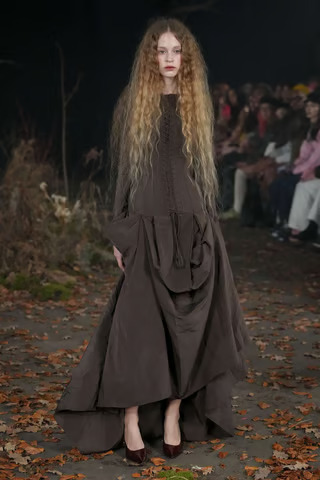 Models wore voluminous gowns with deliberately uneven shapes, tied with ribbons and finished with metal details. Thick Aran knits and oversized shearling coats were layered over delicate lace and tulle, creating a contrast between heavy and light fabrics. A red rosette motif, inspired by traditional Irish horse fairs, appeared throughout on dresses, belts and coats.