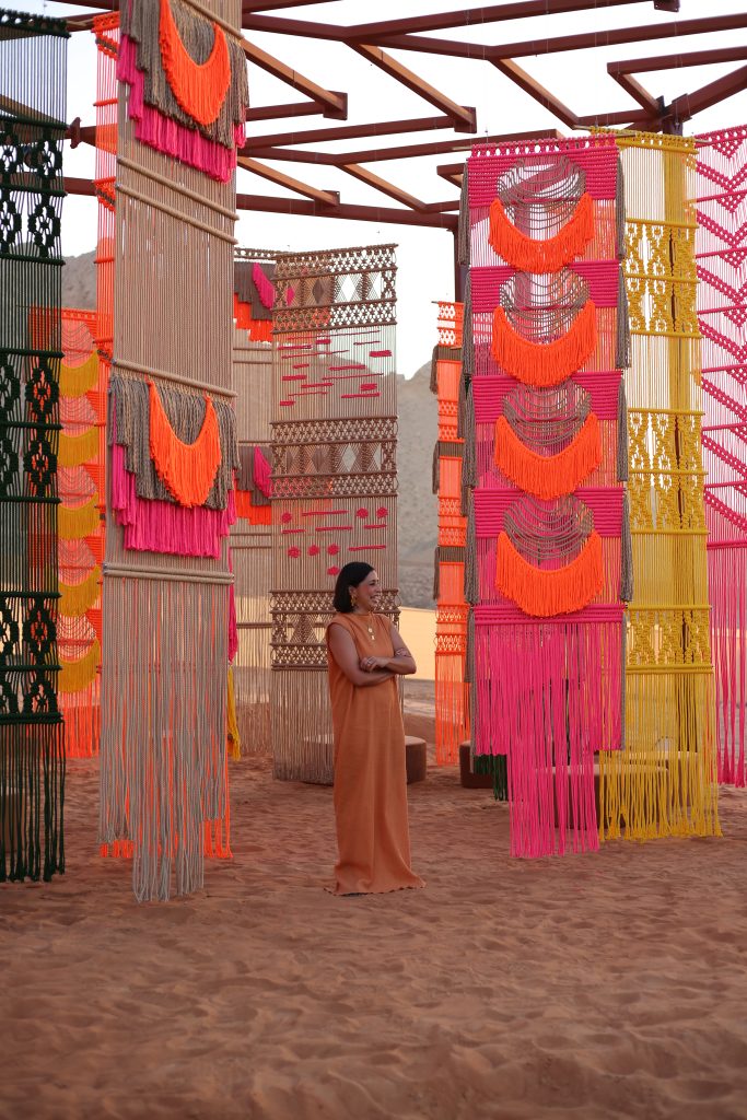 Milla Novo’s creative work tells a story of culture, language and memory. The Netherlands-based fibre artist has built an international practice around hand-knotted textiles inspired by her Chilean heritage. She creates large-scale wall hangings and immersive installations that blur the boundaries between art, design and architecture. Most recently, her work took on a new dimension in the Mleiha Desert in Sharjah, where Novo presented an outdoor installation as part of Tanweer Festival, marking a defining moment in her evolving relationship with the Middle East.