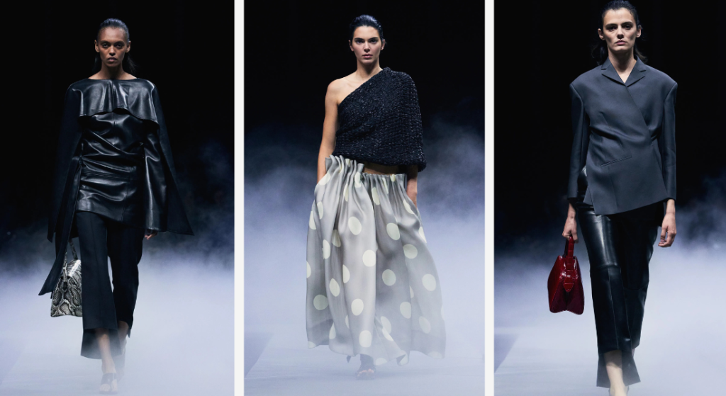 Veronica Leoni’s debut collection for Calvin Klein expanded on her “clothes for life” vision. Minimalism, modernity, and American sensibility defined the show, with trench coats, blazers, denim, and underwear-inspired pieces reimagined in neutrals with accents of scarlet and pink. Innovative textures in leather and technical fabrics added depth. The front row included Lily Collins, Emily Ratajkowski, and Chris Briney, cementing the show’s headline-grabbing status.