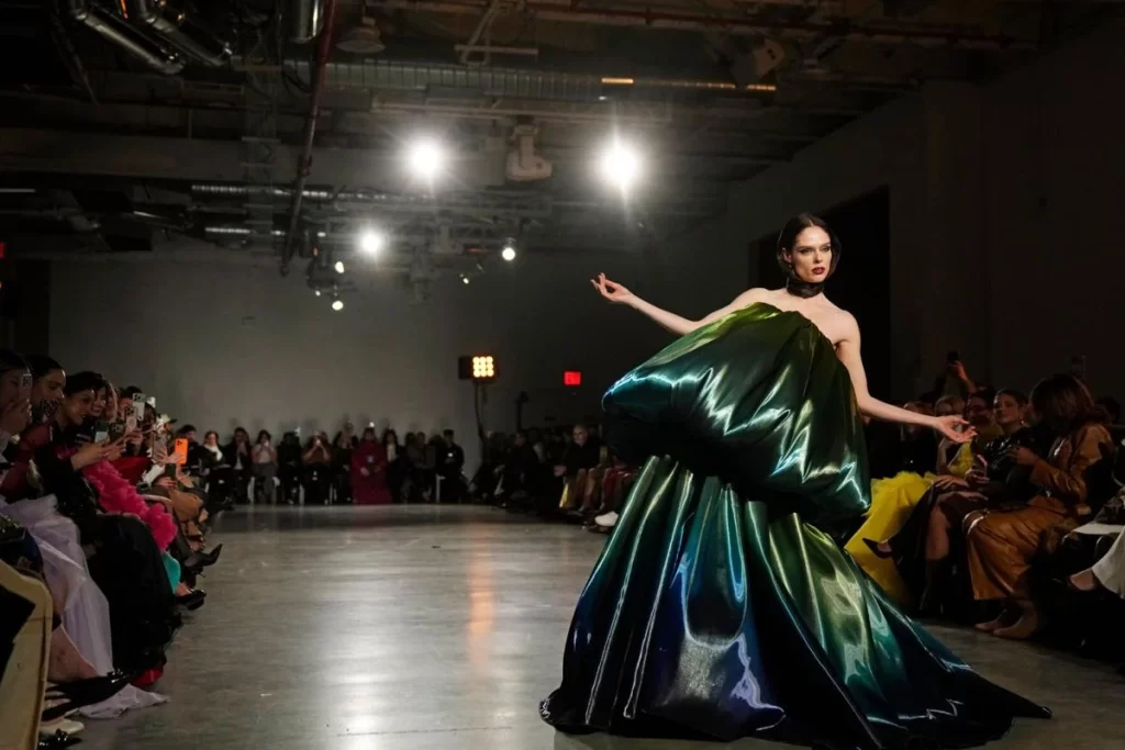Standout looks included a chartreuse lace cropped jacket paired with a maxi skirt, and a bright green ombré bubble gown worn by supermodel Coco Rocha, who closed the show in her signature theatrical style. The dress was reportedly completed just moments before the show, having been designed only 48 hours earlier.