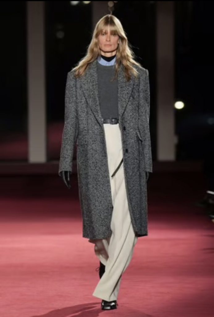 Held along the structured stairwell of the Metropolitan Opera House, the runway featured long structured jackets, asymmetrical suits, scarf-like wraps and sharply tailored trousers, all anchored around practicality and wearability.