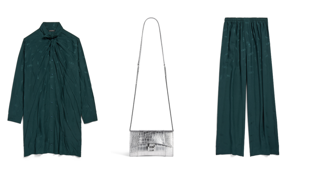 Balenciaga launches an exclusive series celebrating the month of Ramadan, reimagining signatures of the House in new colorways featuring new graphic artworks. Several styles of T-shirt, hoodie, cap, and elasticized shorts are embroidered with an Arabic Balenciaga logo, while fluid silk blouses, pants, collared dresses, and scarves showcase multiple jacquard logo patterns, in dark green and light peach.  The exposed soles of iconic Speed 2.0 sneakers are seen in gold, while the Avenue Pump, Cozy BB Mule and Sandal, Furry Slide, and Satin Knife Pump, in shades of grey and blue, are adorned with gold hardware or black strass. Classic small Hourglass and Le City Bag styles are introduced in dark maree, faded dark blue, volcanic rock, army green, gold, and metallic silver soft crocodile-effect and arena leather.