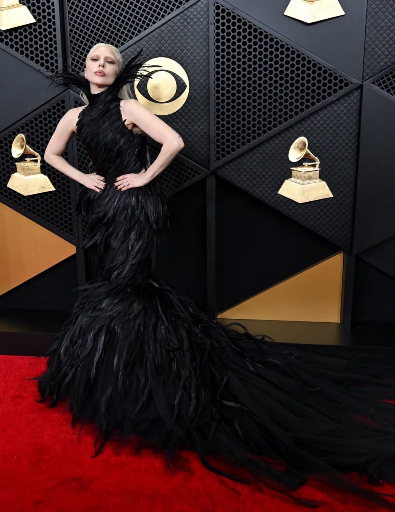 Lady Gaga is never one to step onto a red carpet without leaving an impression — and this year was no exception. Wearing a custom black feathered gown by Matières Fécales, she arrived commanding the room. The look channelled full Black Swan energy, with a high halter neckline, sculptural hips, a mermaid silhouette and a sweeping feather-and-tulle train. The all-black, avian ensemble perfectly echoed the dark aesthetic of her Mayhem era, which earned her the award for best pop vocal album. She also took home best dance/pop recording for “Abracadabra” and shared the producer of the year (non-classical) honour with Rosé and Jade for the hit “Cirkut,” alongside producer Cirkut.