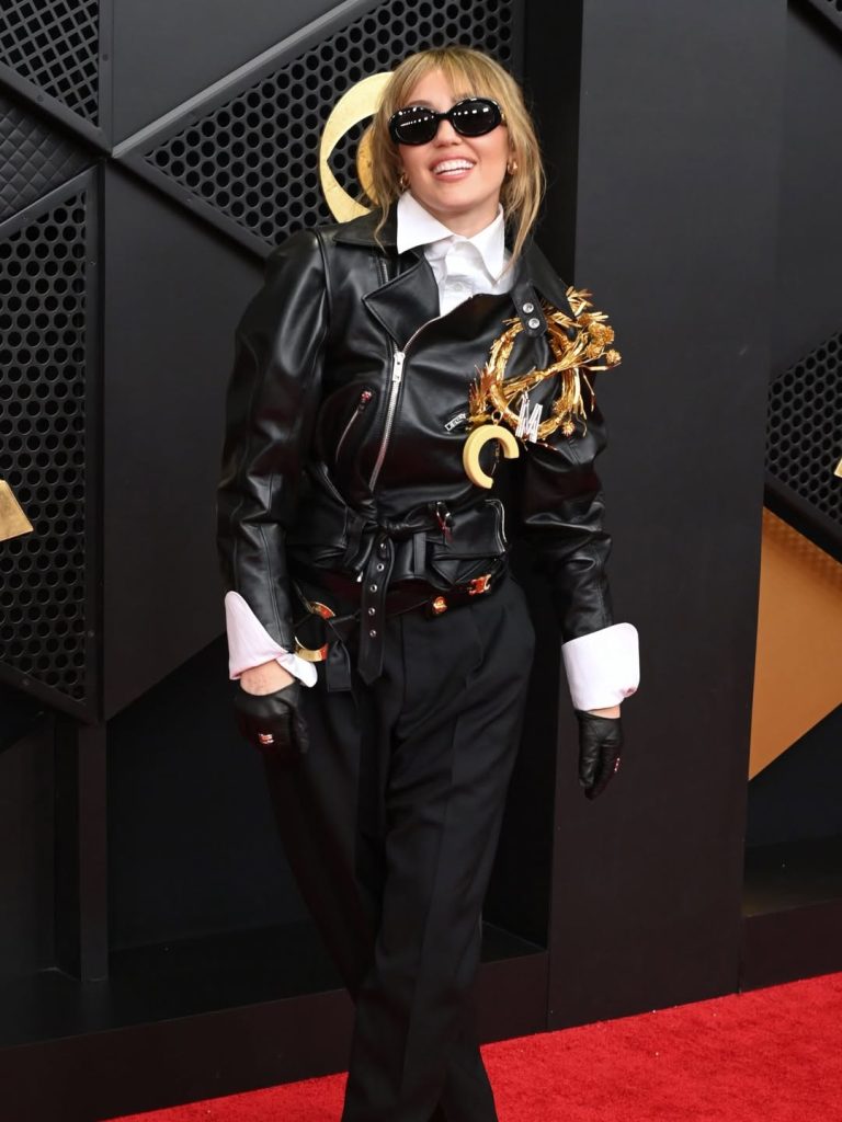 Miley Cyrus rocked the 2026 Grammys red carpet in a custom Celine Resort 2026 ensemble that screamed rockstar edge. The look featured a belted black leather motorcycle jacket over a crisp white collared shirt, paired with voluminous pleated "carrot" pants and sharp black stilettos. The standout was a massive gold brooch emblazoned with her initials "M.C."—pure statement power. She coordinated with fiancé Maxx Morando's all-black vibe, finishing with bronde waves, soft bangs, bronzed eyes, and a matte nude lip.
