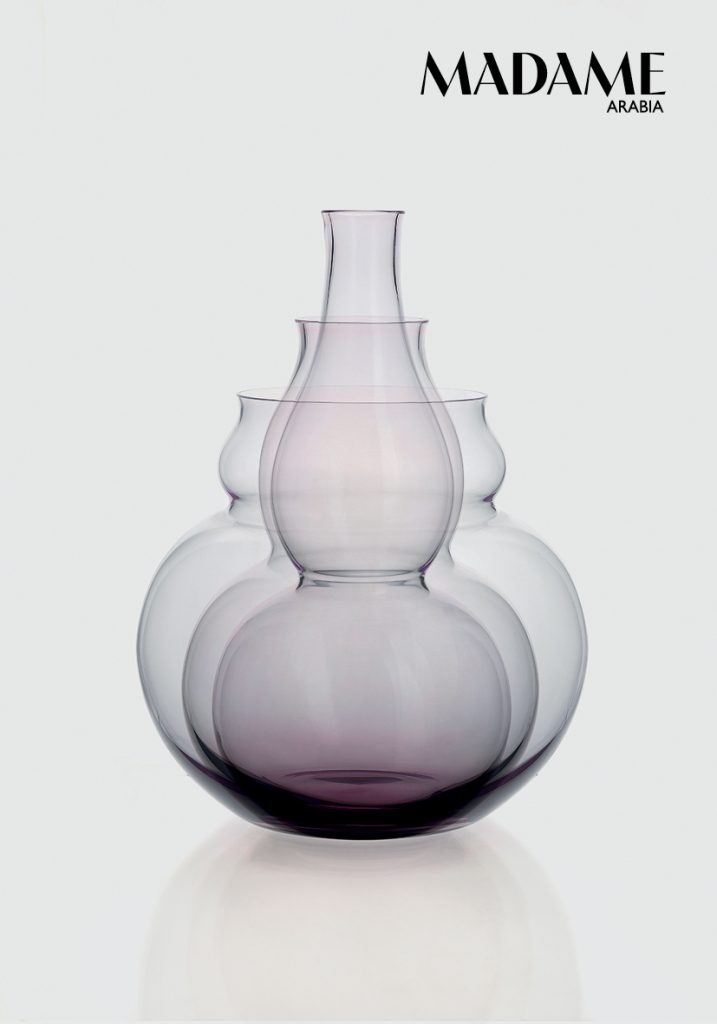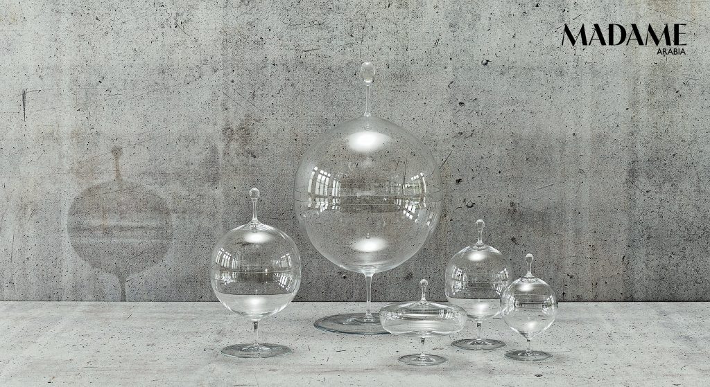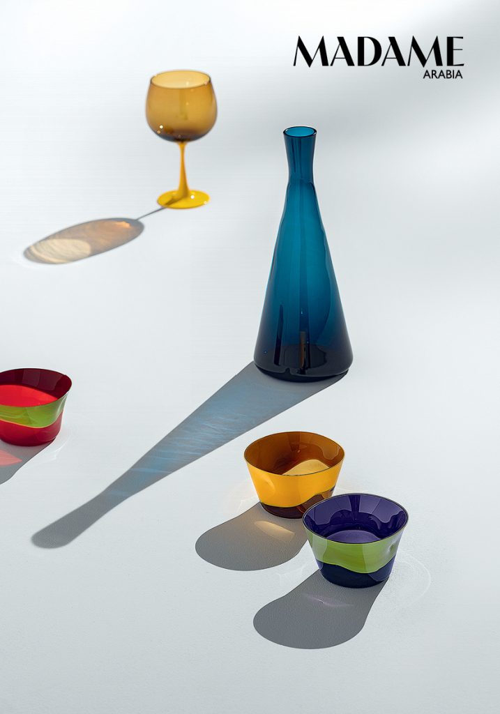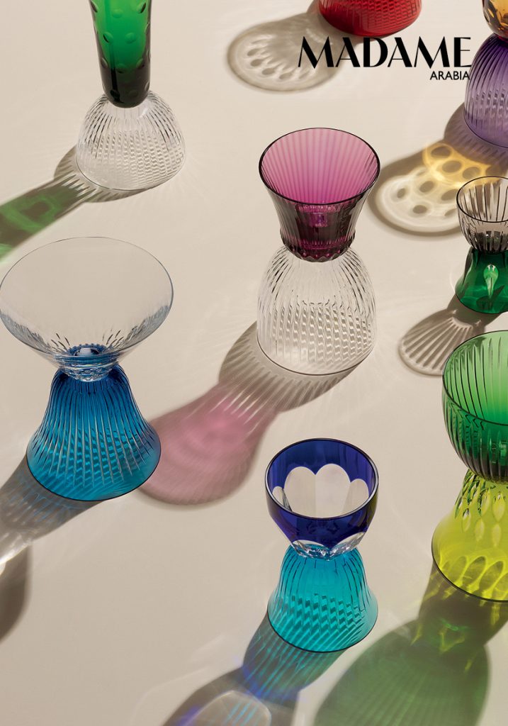 Dandy features a tipsy-looking dimple that makes the colourful tumblers and small bowls (Dhs408) easy to grip. The Burlesque Burgogna glasses shake up the classic goblet shape with opaline glass and a trumpet stem, in china yellow (Dhs537), ruby red, or mi-parti. The Cristalleria Nason Moretti from Murano was born in the 1920s, but was shaped by the mid-century era of great Italian designers such as Giò Ponti and Umberto Nason, who imagined a more colourful, optimistic world. In 1955, Nason developed the reversed incamiciato technique – milky, opaque glass on the outside, colour on the inside, a specialty to this day. How else can you recognise a Nason Moretti glass? “Twisted torsé motifs, geometric, understated bowls, trumpet bases, and colour,” say the heads of the house, Giorgio, Marco, and Piero Nason. Cheers!