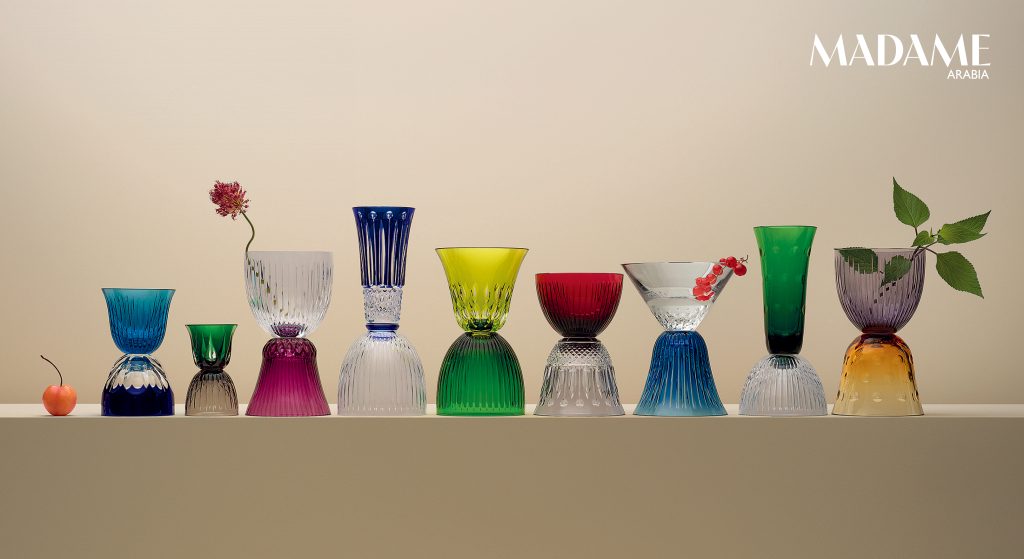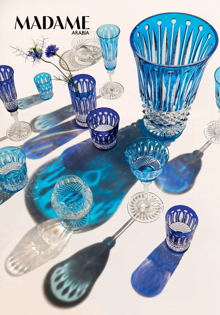 Saint Louis’s Art Deco glass series Tommy, with its beaded engraving, is available in clear crystal or colour. For parties, flutes, coupes, and even an ice bucket are on offer. With these, even the act of drinking water (most beautifully in royal blue) becomes something precious