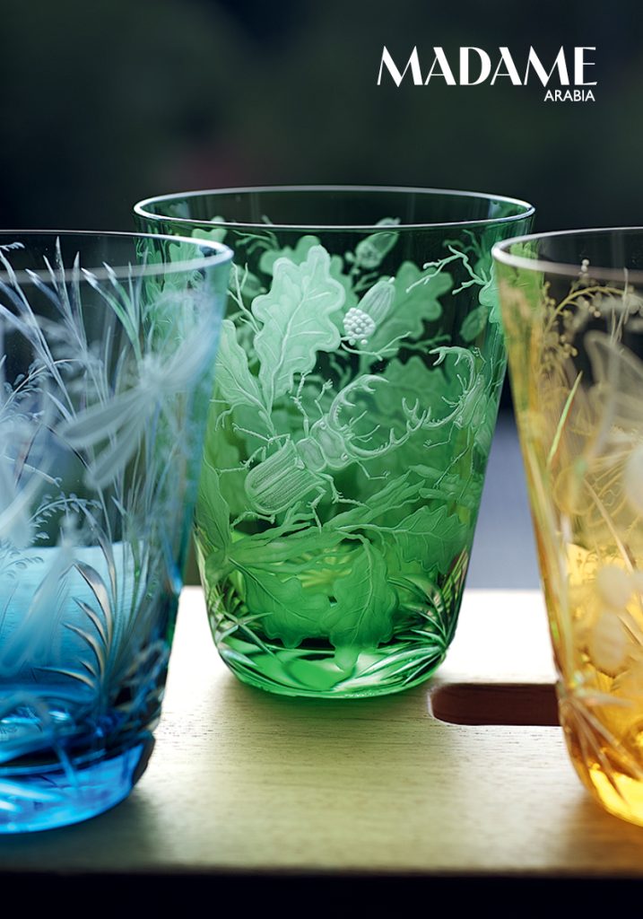 A forest clearing opens up, deep and luminous. A deer grazes, wild ducks burst through the undergrowth… The Schliersee glass (Dhs1,051) and the animal and plant motifs of the new Insects series (tumblers, around Dhs1,395) celebrate the artistry of the Bavarian manufactory in particularly striking fashion. These are engravings on cased glass that, when caught by a ray of sunlight, become painterly, almost sculptural. The colours, too – amber, aquamarine, reseda green, an enchanted violet – seem drawn straight from a fairy tale. Little wonder, then, that the manufactory, founded in 1836 in Zwiesel, gained worldwide prestige during the era of the fairy tale king, Ludwig II, and under the von Poschinger family. The aura of the “Kini” and his fantasy castles still resonates even in contemporary designs. A magical legacy.