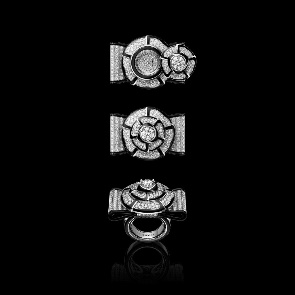 From 1913, Gabrielle Chanel borrowed the camellia, which she loved for its pure esthetic, from the dandies who attached it to the buttonhole of their jacket. A white camellia on a black jacket. White on black. Black on white. Rooted in this legacy, this striking contrast breathes life into the NOEUD DE CAMÉLIA collection. Composed of four wristwatches and a secret ring, NOEUD DE CAMÉLIA combines the watchmaking and jewelry Métiers d’art with those of Couture. A bracelet embroidered with sequins by Maison d'art Lesage; sparkling gold worked like a grosgrain ribbon; virtuoso diamond setting where light sculpts the upstrokes and downstrokes; the extreme sophistication of the dials hidden under a diamond… In a sumptuous play of volumes, NOEUD DE CAMÉLIA adorns the wrist with sculptural luminosity.