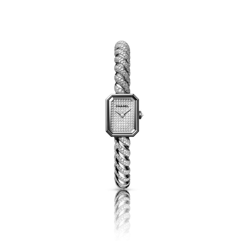 While borrowing from the CHANEL wardrobe one of its most emblematic signature elements - the braid trim - PREMIÈRE GALON suggests a new lesson in style and sustains the audacious heritage of the Première watch, born from absolute freedom of creation in 1987, and whose timeless allure keeps the pace of the present. Unveiled in yellow gold in 2025, the PREMIÈRE GALON’s bracelet is a rigid bangle made of a twisted braid that offers a new way of wearing. Gabrielle Chanel used braid trim on her suits to highlight the contours, adorn pockets and cuffs, and structure the silhouette. In 2026, it is revealed in a new white gold version. This color imbues the PREMIÈRE GALON wardrobe with a luminous sophistication.